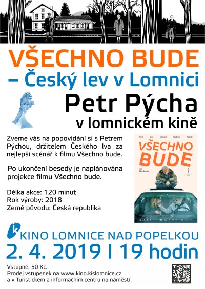 Město Lomnice nad Popelkou a Kulturní a informační středisko Lomnice nad Popelkou zvou v úterý 2. dubna od 19 hodin do Kina Lomnice nad Popelkou na setkání s lomnickým autorem Petrem Pýchou, který v sobotu 23. 4. 2019 získal filmovou cenu Český lev 2019 za scénář k filmu Všechno bude, za což mu právem náleží veliká gratulace od všech lomnických filmových fanoušků!