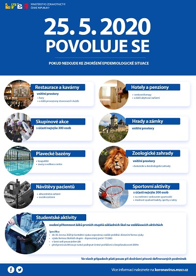 Od pondělí 25. května se už mohou otevřít restaurace i ve vnitřních prostorech (venkovní zahrádky již byly otevřené), hotely a penziony, hrady a zámky, zoologické zahrady či plavecké bazény. Již dříve od začátku května byly s omezeními otevřené muzea či knihovny. Dále je možné pořádat skupinové akce do 300 osob (dosud bylo povoleno do 100 osob), sportovní akce a také studentské aktivity do 300 osob, jsou povolené i návštěvy domovů seniorů a zdravotnických zařízení.