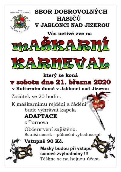 SDH Jablonec nad Jizerou pořádá v místním kulturním domě v sobotu 21. března od 20 hodin maškarní karneval. K maškarnímu rejdění a tančení bude hrát kapela Adaptace z Turnova. Občerstvení zajištěno, soutěž masek má vyhodnocení o půlnoci.