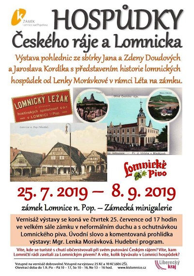 Výstava pohlednic ze sbírky Jana a Zdeny Doudových a Jaroslava Kordíka nazvaná Hospůdky Českého ráje a Lomnicka bude zahájena s představením historie lomnických hospůdek od Lenky Morávkové v rámci série akcí Léto na zámku 2019.