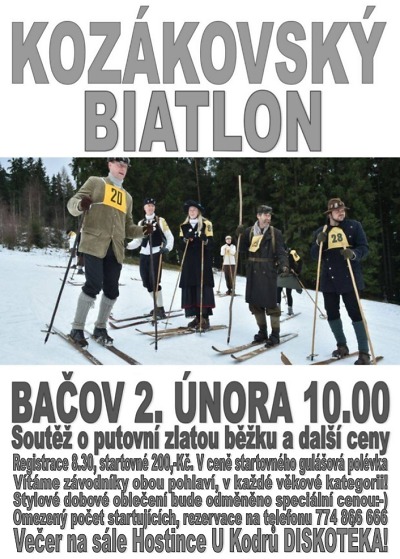 Na Bačově u Kozákova, na louce před Hostincem u Kodrů, se v sobotu 2. února koná Kozákovský biatlon. Součástí bude i soutěž o putovní zlatou běžku a další ceny. Registrace závodníků v 8.30, start ve všech kategoriích, včetně dobových kostýmů, je v 10.00.
