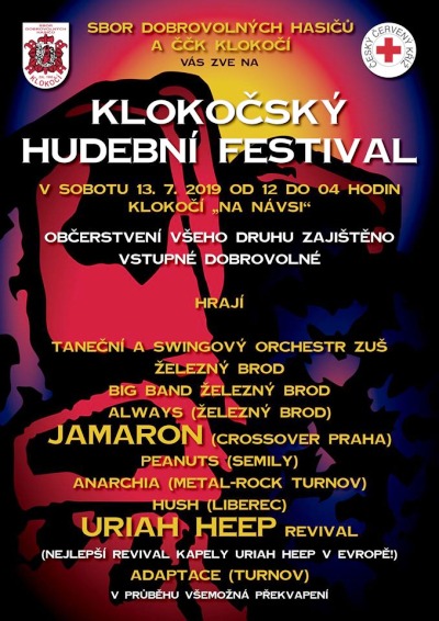 Klokočský hudební festival se koná v sobotu 13. července od 12 do 04 hodin v Klokočí na návsi. Zahrají taneční a swingový orchestr ZUŠ Železný Brod, Big Band Železný Brod, Always, Jamaron, Peanuts, Anarchia, Hush, Uriah Heep revival a Adaptace.