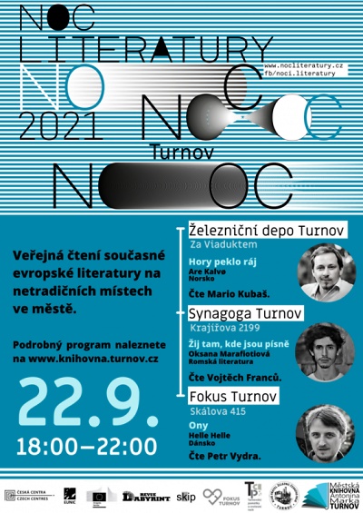 Noc literatury jsou veřejná čtení současné evropské literatury na netradičních místech. Tento projekt s mezinárodním přesahem trvá již patnáctým rokem. Turnovská knihovna se rozhodla, že v roce 2021 se též zúčastní tohoto projektu a vybrala tři turnovské prostory: železniční depo, synagogu a novou budovu Fokus Turnov.