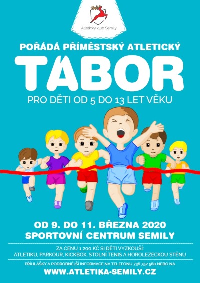 Jarní příměstský atletický tábor pořádá AK Semily a SC Semily od pondělí 9. března do středy 11. března. Tento příměstský tábor je určen pro děti od 5 do 13 let věku. Koná se v hale Sportovního centra Semily vždy od 8 do 16 hodin.