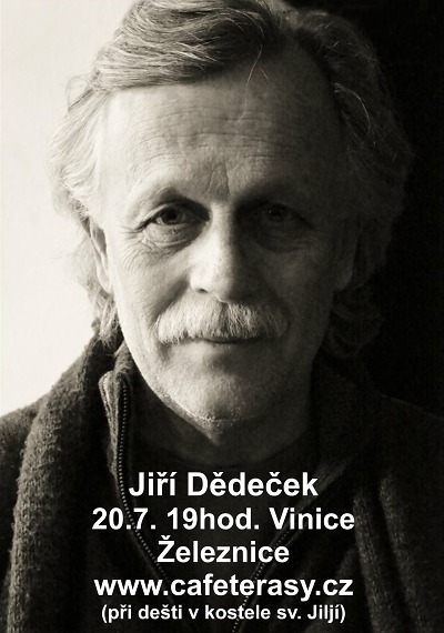 Koncert Jiřího Dědečka se uskuteční 20. července od 19 hodin v Železnici. Při hezkém počasí bude probíhat koncert na vinohradu nad kavárnou, pokud by pršelo, přemístí se koncert do kostela.