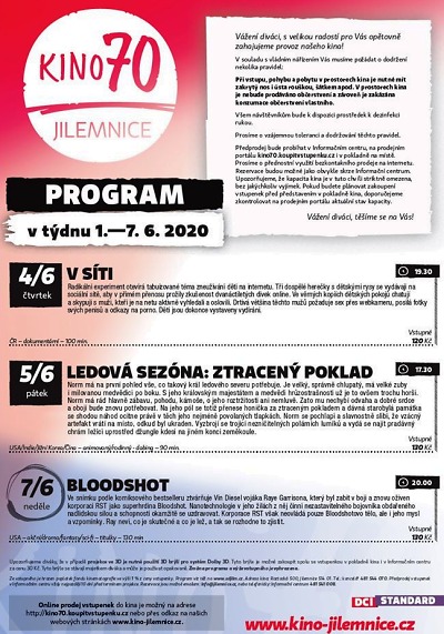 Od úterý 12. května je znovu otevřené Kino 70 Jilemnice. Divákům se ve čtvrtém týdnu od otevření představí filmy V síti, Ledová sezona: Ztracený poklad a Bloodshot.