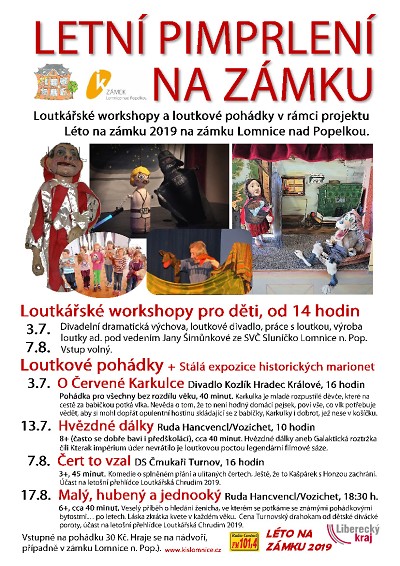 Loutkářské workshopy a pohádky se konají během prázdnin v rámci projektu Léto na zámku 2019. Zároveň si lze při představení prohlédnout expozici historických marionet.