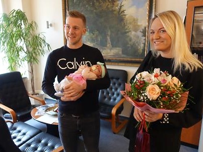Malá Nelinka přišla s rodiči na návštěvu na radnici, kde maminka převzala od starosty Tomáše Hockeho v upomínku zlatý šperk v podobě srdce a květinu.
