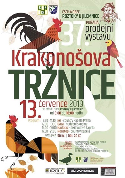 Chovatelé, zahrádkáři či příznivci country hudby si jistě nenechají ujít už 37. ročník Krakonošovy tržnice v Roztokách u Jilemnice. Tradiční a velmi oblíbená akce se koná v sobotu 13. července 2019. Bohatý bude doprovodný program v podobě country kapely Jez, odpoledne zahrají i kapely Oáza, Nadoraz a Nonstop.