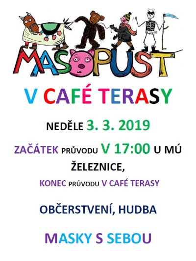 Masopust v Café Terasy začne v neděli 3. 3. 2019 srazem maškar u Městského úřadu v 17.00. Půjde se městem přes Muzeum do Café Terasy, kde všechny čeká veselice. Připravena je hudba a chutné masopustní občerstvení. Zváni jsou všichni, zvláště pak maškary všeho druhu! Vezměte si s sebou masky, ať je pěkně veselo!