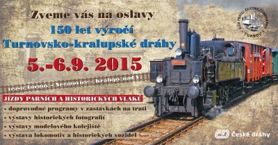 Nadcházející víkend 5. a 6. září patří oslavám 150. výročí vzniku Turnovsko - kralupské dráhy. Města a obce na trase budou po oba dva dny projíždět zvláštní parní a motorové vlaky, ve vybraných stanicích pořadatelé připravili doprovodný program, nejvíce akcí proběhne přímo v Turnově.