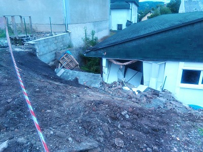Aktualizováno o fotografie i vyjádření policie: Vlivem deště a vlhka, ale možná také kvůli blízké pracovní činnosti, se sesunula v sobotu 12. srpna opěrná zeď u domu pod železniční tratí v Semilech patřící společnosti Tiskárna Glos. Na místě zasahovaly hasičské jednotky HZS Semily, JSDHO Semily a Benešov u Semil, které zajistily prostor břehu proti dalšímu sjetí i vstupem nepovolaných osob.