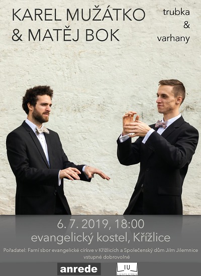 V evangelickém kostele v Křížlicích se koná v sobotu 6. července koncert trumpetisty Karla Mužátka a varhaníka Matěja Boka. Vstupné je dobrovolné, pořadateli jsou Farní sbor evangelické církve v Křižlicích a Společenský dům Jilm Jilemnice.