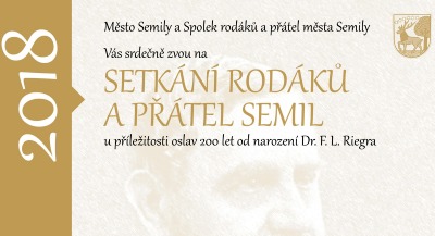 Město Semily a Spolek rodáků a přátel města Semily zvou o víkendu 23. a 24. června na setkání rodáků a přátel Semil u příležitosti oslav 200 let od narození F. L. Riegra.