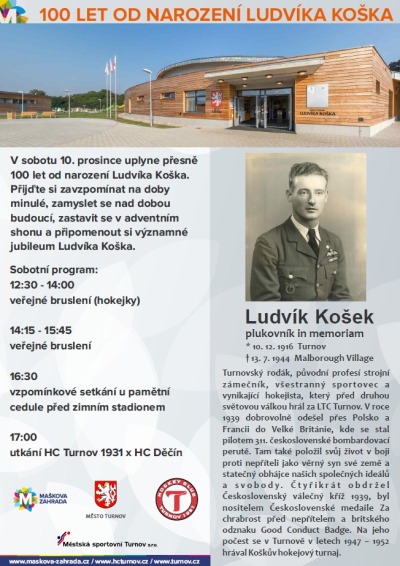 „Dlouholetá tradice, moderní zázemí a široká mládežnická základna - to je současný turnovský lední hokej! Oslavte s námi v sobotu 10. prosince v rámci utkání s nováčkem Krajské ligy mužů Libereckého kraje HC Děčín B 85 let historie nejrychlejšího kolektivního sportu v Turnově. Zvláště, koná-li se na den přesně 100 let od narození plk. RAF Ludvíka Koška - turnovského hokejisty a válečného hrdiny, podle kterého je náš krásný zimní stadion pojmenován. Pietní akt u pamětní desky začíná v 16:30, slavnostní úvodní buly v tradičních 17.00," zve za turnovské hokejisty Pavel Mlejnek.