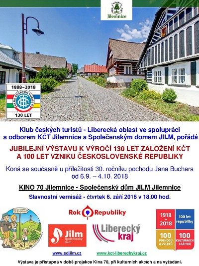 Aktualizováno: Klub českých turistů - Liberecká oblast ve spolupráci s odborem KČT Jilemnice a Společenským domem Jilm, pořádá Jubilejní výstavu k výročí 130 let založení Klubu českých turistů a 100 let vzniku Československé republiky.