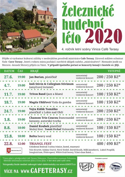 Už 4. ročník letní scény Vinice cafe Terasy se koná opět pod názvem Železnické hudební léto. První akcí bude již 27. června koncert písničkáře Jana Buriana, dále přijede Indi Stivín, Magda Uhlířová či Vojta Kiďák Tomáško a léto zakončí 22. srpna celodenní Triangl fest.