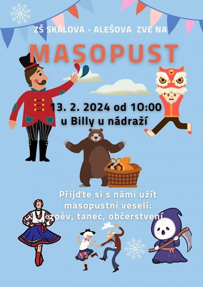Do Turnova se vrací masopustní veselí pořádané 1. stupněm školy v Alešově ulici. Tancování, písničky a pestré masky - to všechno mohou spatřit návštěvníci akce, která se uskuteční v úterý 13. února od 10 hodin na sídlišti u nádraží, u Billy v Turnově II. | více