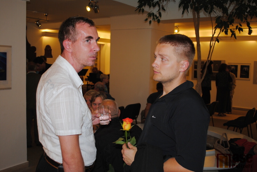 Vernisáž výstavy v Pojizerské galerii pod názvem Semilský fotoklub: Pět zlatých sezón. Tomáš Hyka fotí u profilu Miroslava Mrňáka