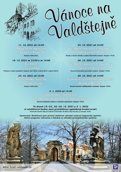 Pestrý program vyvrcholí na Valdštejně 2. ledna novoročním koncertem Hradeckého komorního tucteta, které představí pestrý vánoční repertoár. Výše uvedené kulturní akce se uskuteční za dodržování aktuálních hygienických nařízení.