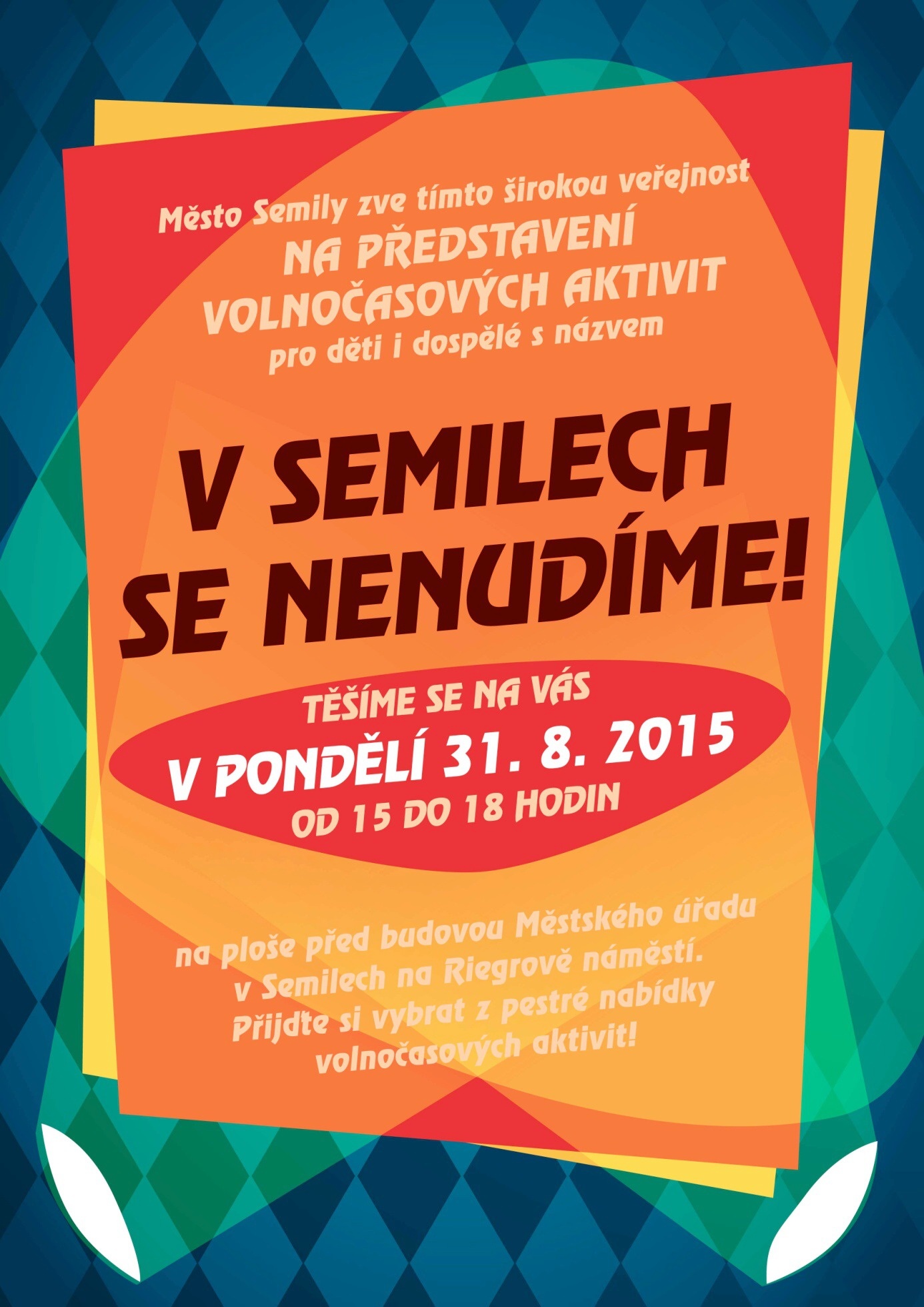 Přehlídku volnočasových aktivit, kroužků a zájmových činností pro děti i dospělé chystá na poslední prázdninový den pro své občany město Semily. Na ploše před budovou Městského úřadu se v pondělí 31. srpna od 15 do 18 hodin budou moci setkat se zástupci i členy nejrůznějších spolků i zájmových sdružení, kteří zde představí svůj okruh činnosti.