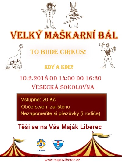 V sobotu 10. února proběhne od 14 hodin v sokolovně ve Vesci další ročník maškarního bálu, který pro širokou veřejnost organizuje přístav vodních skautů a skautek Maják Liberec. Podrobná pozvánka.
