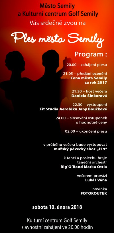Jubilejní desátý reprezentační ples města Semily, na kterém proběhne i udělení Ceny města Semily. Hostem večera je herečka a zpěvačka Daniela Šinkorová, k tanci a poslechu bude hrát Big O Band Liberec. Moderátorem večera bude Lukáš Váňa. začátek v sále KC Golf od 20 hodin, vstupné 100 Kč. Podrobná pozvánka