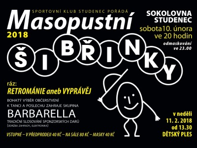Tradiční masopustní šibřinky pořádá Sportovní klub Studenec v sobotu 10. února od 20 hodin v místní sokolovně, odmaskování proběhne ve 23 hodin. Téma je Retrománie aneb Vyprávěj. K dispozici bude bohatý výběr občerstvení, hrát bude kapela Barbarella. Vstuopné v předprodeji 40 Kč, na sále 80 Kč, masky 40 Kč. V neděli 11. února se bude na stejném místě konat od 13.30 Dětský ples. Samostatná pozvánka