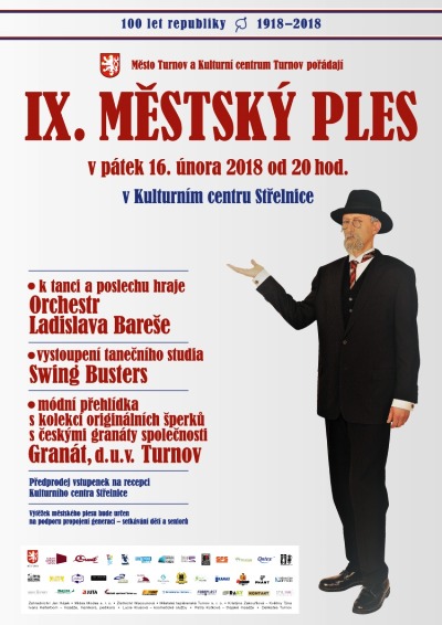 Město Turnov srdečně zve milovníky tance, hudby a dobré zábavy na Městský ples. Již 9. ročník se uskuteční v pátek 16. února 2018 od 20 hodin ve velkém sále Kulturního centra Střelnice. Těšit se můžete na pestrý kulturní program či bohatou tombolu. K tanci a poslechu bude hrát Orchestr Ladislava Bareše. Podrobná pozvánka