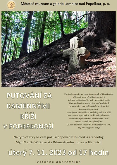 Podzimní přednáškový cyklus lomnického muzea pokračuje již čtvrtou přednáškou. Akce nazvaná Putování za kamennými kříži v Podkrkonoší se uskuteční v úterý 7. listopadu opět od 17 hodin. Vstupné je dobrovolné.