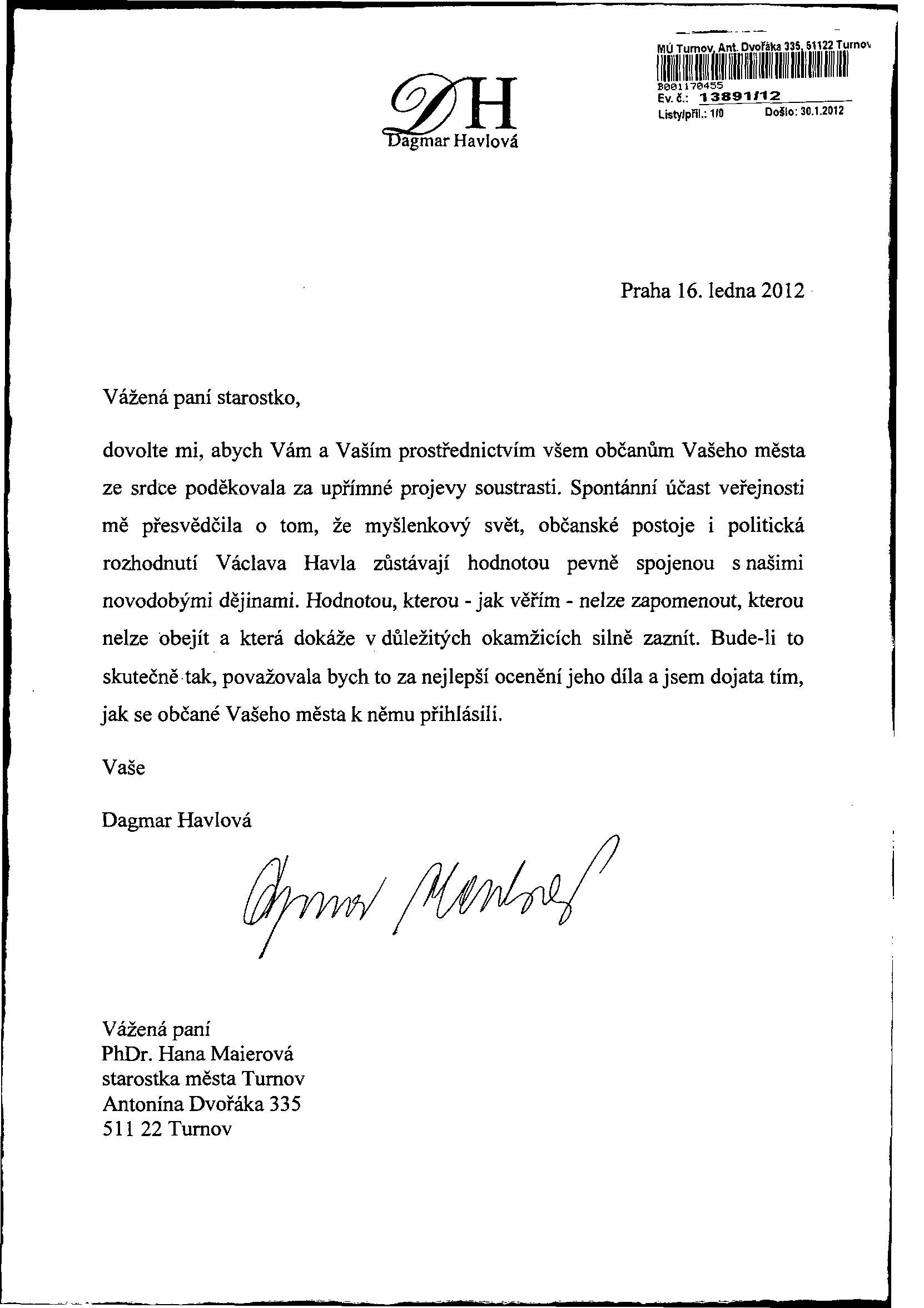 V pondělí 30. ledna obdržela starostka Turnova Hana Maierová dopis od manželky zesnulého prezidenta Václava Havla paní Dagmar Havlové, ve kterém děkuje občanům města Turnova za projevy upřímné soustrasti.