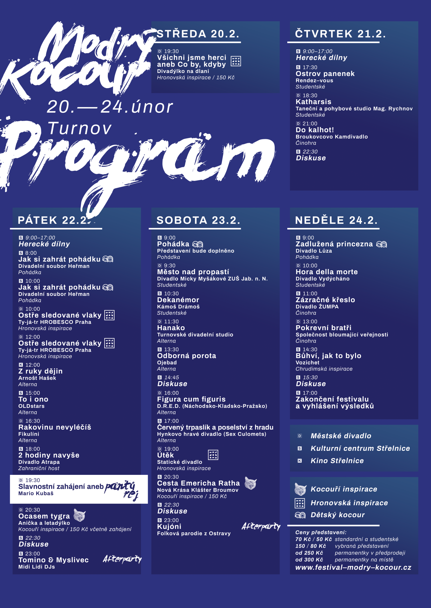 Letošní rok bude rekordní nejenom počtem představení, ale hlavně účastí místních divadelních souborů, představí se jich hned pět. Od nejmladšího souboru Kámoš Drámoš, studentského Rendez-vous a divadelního experimentu Arnošta Haška, po zavedené stálice Turnovské divadelní studio a Společnost bloumající veřejnosti. „Modrý kocour turnovské divadelní scéně očividně svědčí. Množstvím a kvalitou představení se Turnov dostává opět na špici českého amatérského divadla. Ta synergie, spolu s velkou návštěvností festivalu dokonale funguje," řekl ředitel festivalu Mario Kubaš.