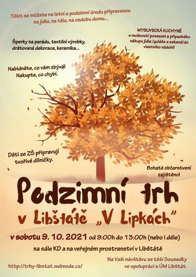 Na náměstí a v prostoru kulturního domu v Libštátě se koná v sobotu 9. října již 27. trh V Lipkách. Účastníky čeká malá změna: Začátek trhu je v 9 hodin a končit bude ve 13 hodin.