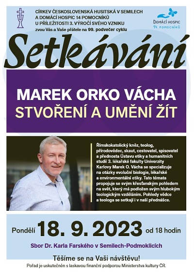 V pondělí 18. září od 18:00 ve Sboru Dr. Karla Farského v Semilech vystoupí se svojí přednáškou Marek Orko Vácha - kněz, teolog, přírodovědec, pedagog, spisovatel a skaut. Od ledna 2022 je členem poradního týmu ministra zdravotnictví Vlastimila Válka.