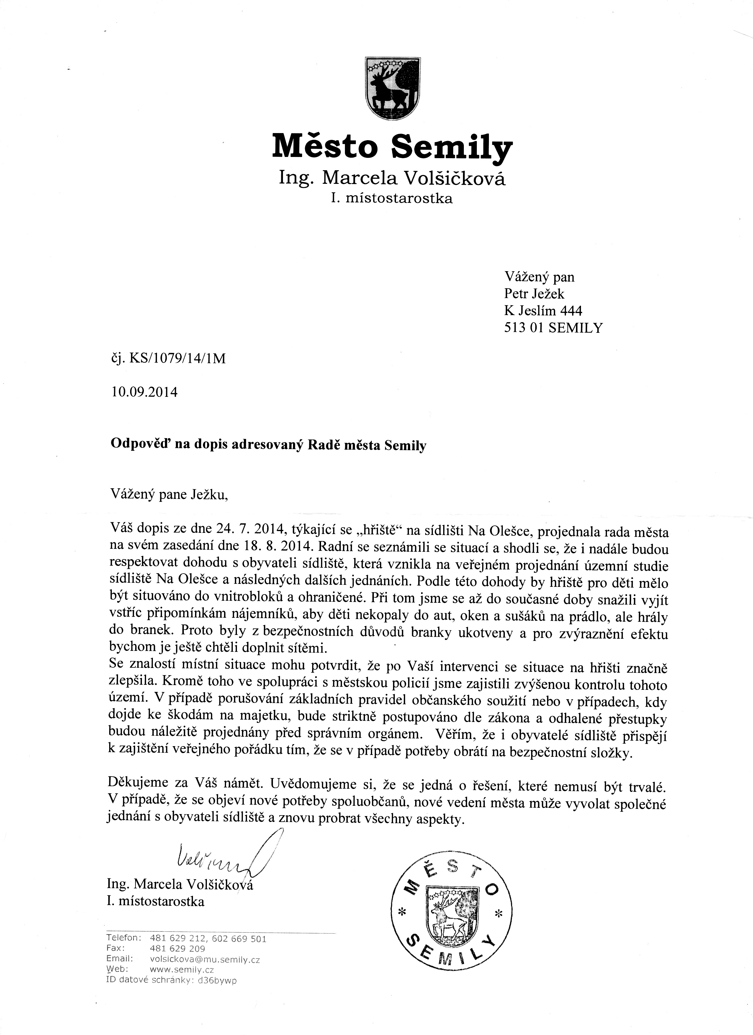 Dávám se do pátrání o jaké jde veřejné projednávání a společně s místostarostkou se dopátráme k tomu, že je myšleno veřejné projednávání studie nazvané Kvalitní život obyvatel sídliště na Olešce ze 7. 4. 2008! Kvůli pracovním povinnostem jsem se tenkrát nemohl onoho projednávání zúčastnit. Zjišťuji, kdo se ovšem z domu, ve kterém bydlím, tenkrát před šesti lety zúčastnil. Tři tehdejší účastnice se nezávisle na sobě shodnou na tom, že proti hřišti už tenkrát protestovaly a požadovaly zahrnout do studie místo hřiště více zeleně. Navíc za šest let vzniklo v onom vnitrobloku parkoviště, byla rozšířena silnice, rozšířeno bylo druhé parkoviště a posunuto pískoviště, čímž se prostor pro hřiště zmenšil minimálně o třetinu, ale spíše ještě víc.