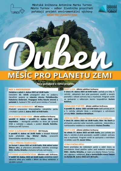 Duben je měsícem projektu environmentální ekologické výchovy Planeta Země - Příroda na Zemi. Tento projekt vstupuje rokem 2022 do 14. ročníku svého trvání. Pořádá se v rámci aktivit Zdravého města a MA21 ve spolupráci s městem Turnov, odborem životního prostředí, který je hlavním pořadatelem.