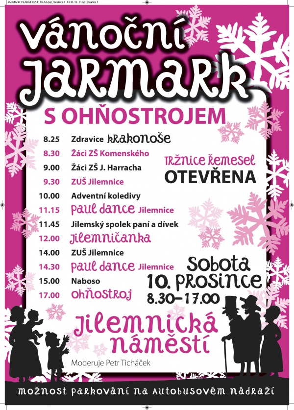 Kulturní program (náměstí Jilemnice 10. 12. 2016): 8:25 Zdravice Krakonoše, 8:30 Žáci ZŠ Komenského, 9:00 Žáci ZŠ J. Harracha, 9:30 ZUŠ Jilemnice, 10:00 Adventní koledivy, 11:15 Paul dance Jilemnice, 11:45 Jilemský spolek paní a dívek, 12:00 Jilemničanka, 13:30 ZUŠ Jilemnice, 14:00 Paul dance Jilemnice, 15:00 Naboso, 17:00 Ohňostroj.