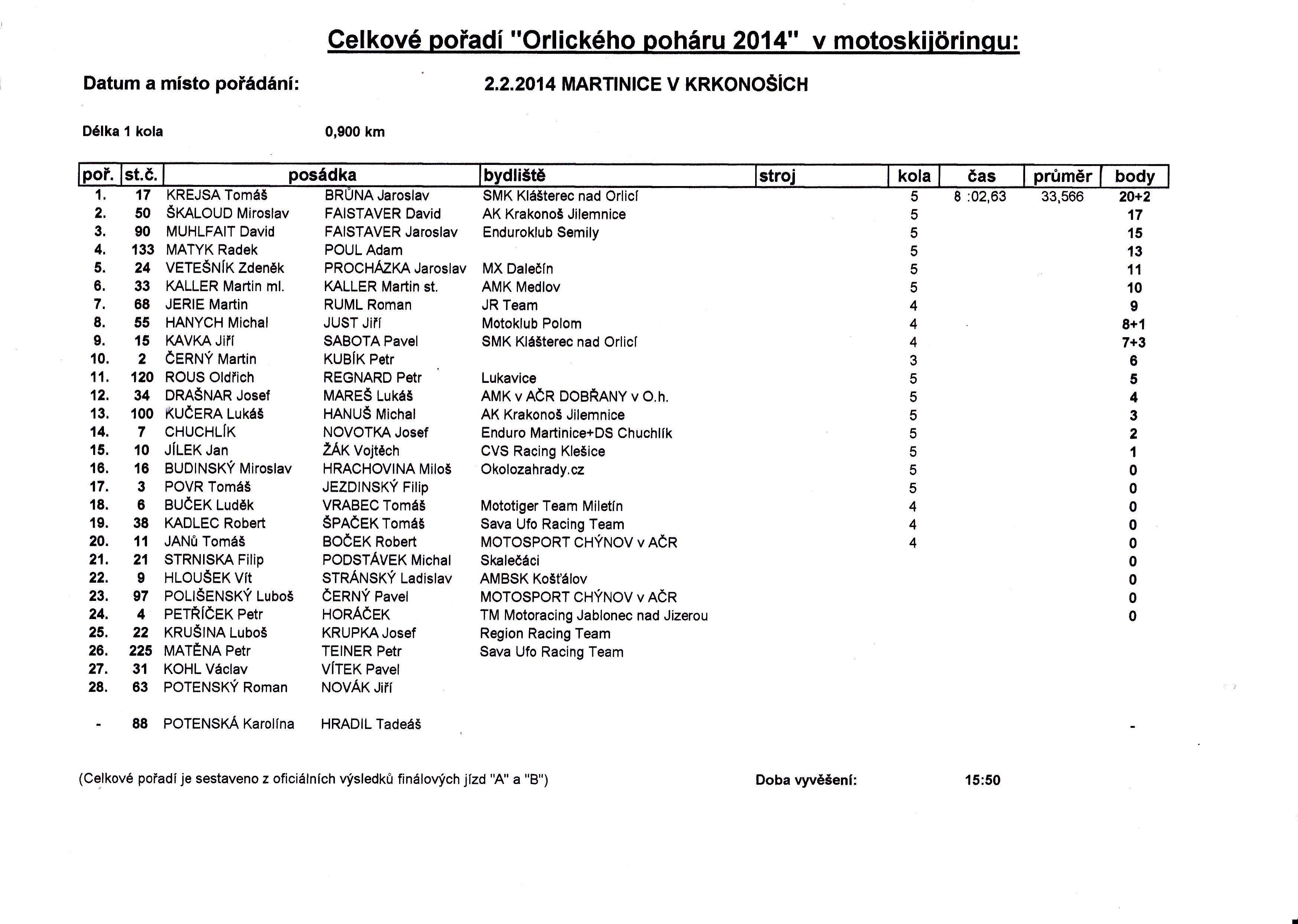 Orlický pohár: 1. Krejsa Tomáš a Brůna Jaroslav (SMK Klášterec n. O.), 2. Škaloud Miroslav a Faistaver David (AK Krakonoš Jilemnice), 3. Mühlfait David a Faistaver Jaroslav (Enduro klub Semily), 4. Matyk Radek a Poul Adam, 5. Vetešník Zdeněk a Procházka Jaroslav (MX Dalečín), 6. Kaller Martin ml. a Kaller Martin st. (AMK Medlov). Kompletní výsledky si můžete stáhnout pod článkem.