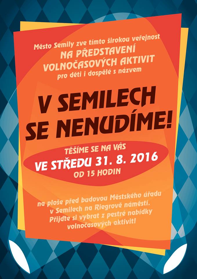 Po loňské premiéře programu představení volnočasových aktivit pro děti i dospělé v Semilech se akce opakovala i letos a proběhla v poslední den prázdnin, tedy ve středu 31. srpna, od 15 hodin na ploše před budovou městského úřadu na Riegrově náměstí v Semilech.