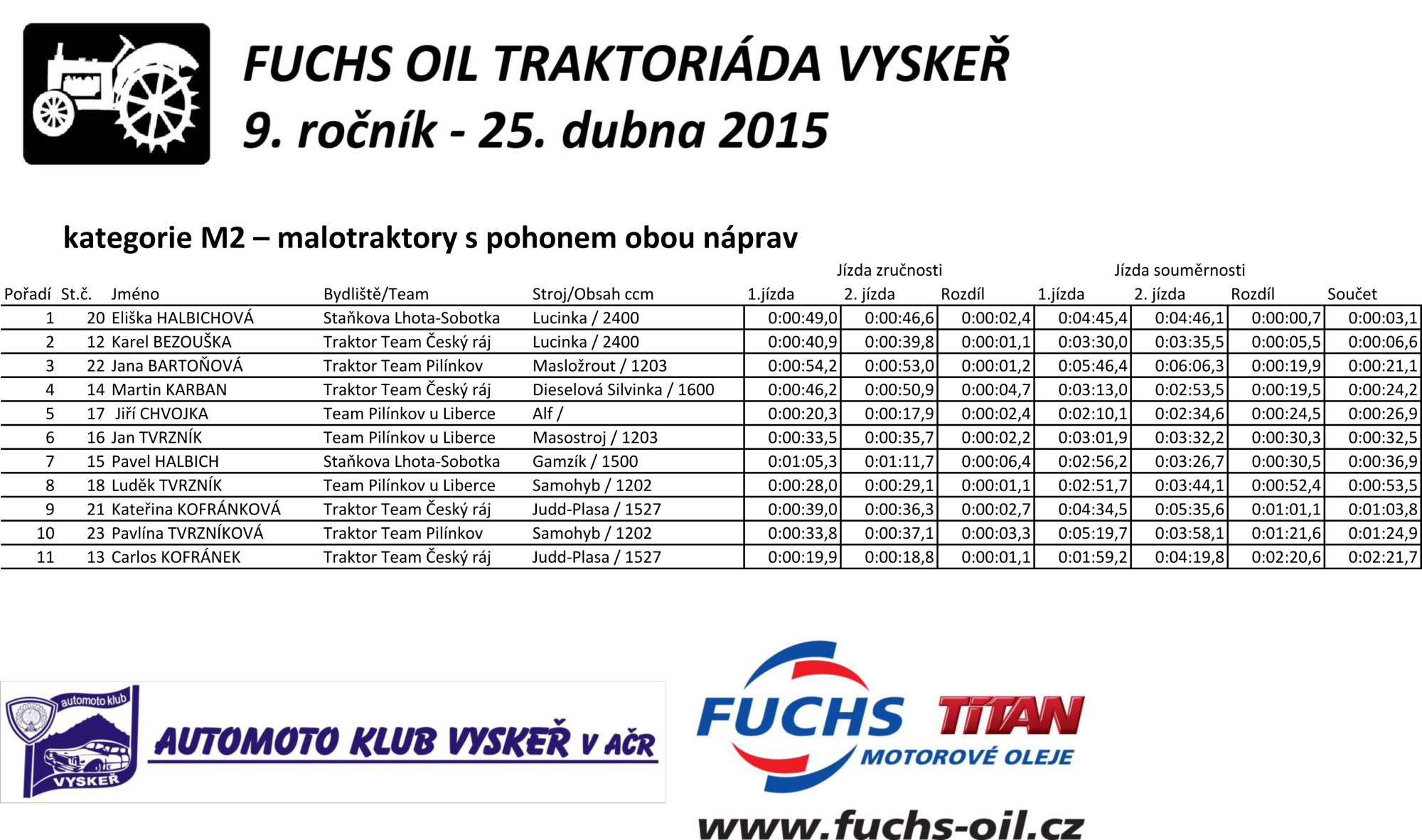Do pořadí v karegorii M2 (malotraktor domácí výroby s pohonem obou náprav) „promluvily" ženy, zvítězila Eliška Halbichová ze Staňkovy Lhoty, druhý skončil Karel Bezouška ze Spařenců a třetí dojela Jana Bartoňová z Traktor teamu Pilínkov.