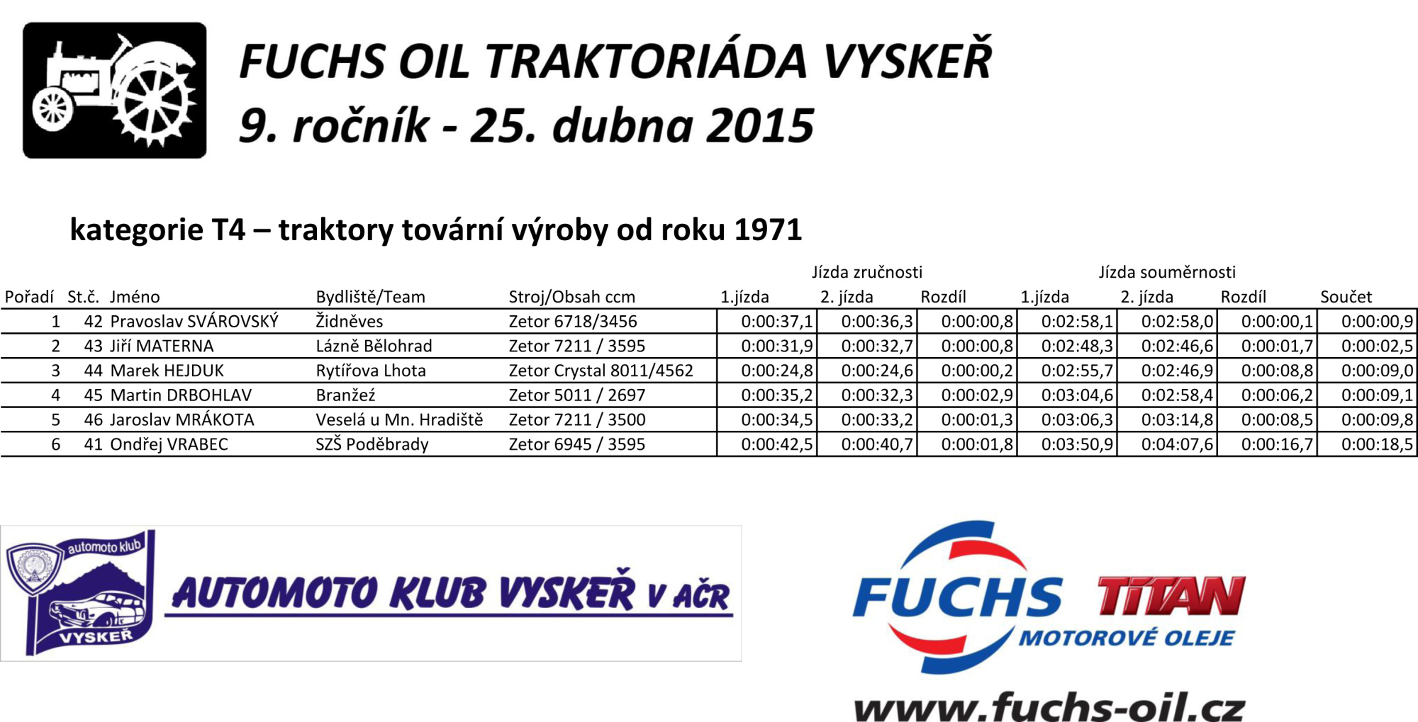 V kategorii T3 (tovární traktory do roku 1970) zvítězil Jan Spěšný ze Židněvse před Petrem Loumou z Kozlov-Mladějov a třetím Oldřichem Menčíkem z Března.
