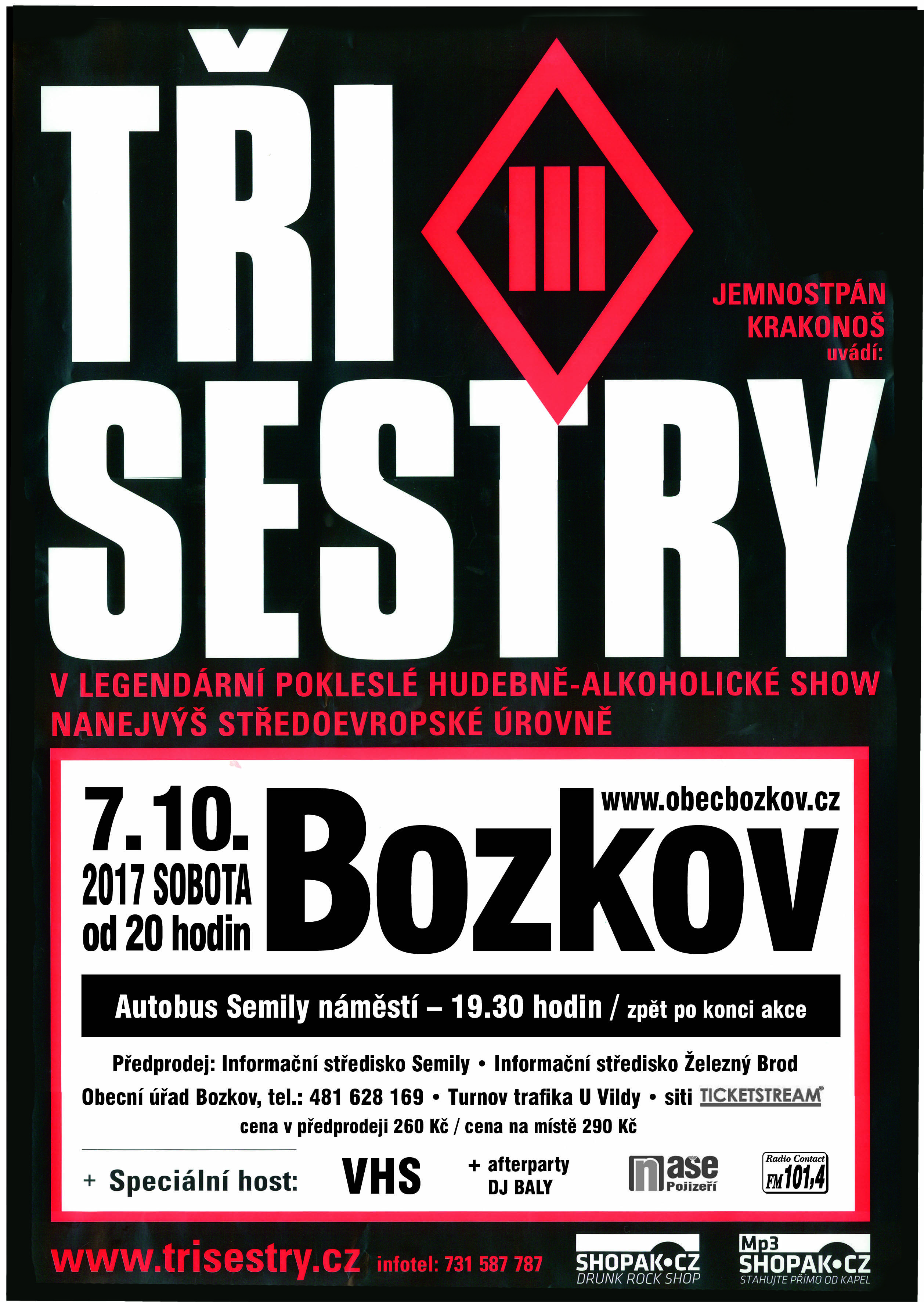 V Bozkově na podzim už tradičně vystoupila se svou legendární pokleslou hudebně-alkoholickou show maximálně středoevropské úrovně skupina Tři sestry. Letos koncert připadl na sobotu 7. října. Jako předkapela zahrála skupina VHS a dohrávku na afterparty obstaral DJ Baly.