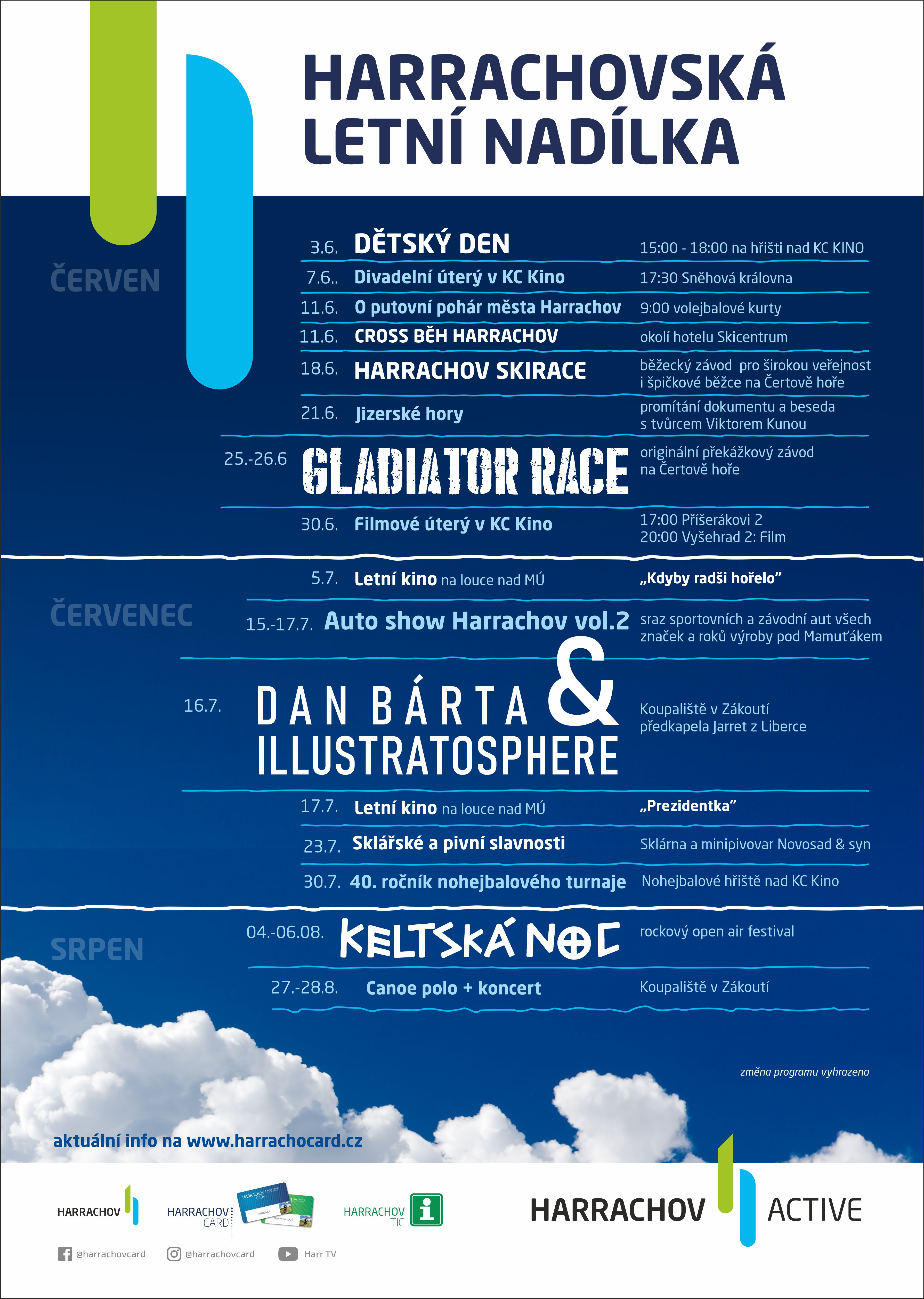 Kromě krásné přírody, sportu a odpočinku nabízí Harrachov také kulturní a sportovní program. Největšími sportovními akcemi bude Gladiator Race a Skyrace, který letos bude také kvalifikací na mistrovství Evropy. V kultuře nebude chybět tradiční Keltská noc ani Harrachovské slavnosti. Kompletní seznam akcí je dostupný na webu www.harrachovcard.cz.
