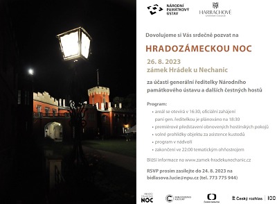 Pomyslným vyvrcholením hlavní sezony na hradech a zámcích ve správě Národního památkového ústavu je oblíbená Hradozámecká noc, která letos připadne na sobotu 26. srpna. Do této akce se zapojují i nestátní a soukromé subjekty, celkově si letos návštěvníci mohou vybírat z nabídky 79 objektů a institucí. Centrem Hradozámecké noci bude zámek Hrádek u Nechanic jako jeden z pilířů projektu NPÚ Po stopách šlechtických rodů: Harrachové - vznešenost zavazuje.