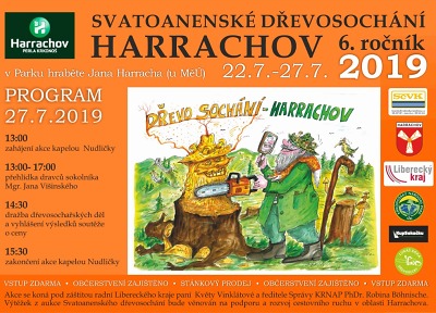 Už 6. ročník Svatoanenského dřevosochání v Harrachově se koná od pondělí 22. do soboty 27. července. Poslední den bude zakončen i kulturním programem, když od 13 hodin zahraje kapela Nudličky, poté dojde na přehlídku dravců Jana Višinského, od 14.30 proběhne dražba dřevosochařských děl a program zakončí v 15.30 další vystoupení kapely Nudličky. Samostatná pozvánka