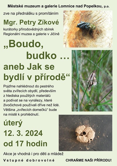První přednáška jarního muzejního cyklu doplněná o promítání se v lomnickém muzeu uskuteční v úterý 12. března od 17 hodin pod názvem Boudo, budko ...aneb Jak se bydlí v přírodě Petry Zíkové, kurátorky přírodovědných sbírek Regionálního muzea v Jičíně.