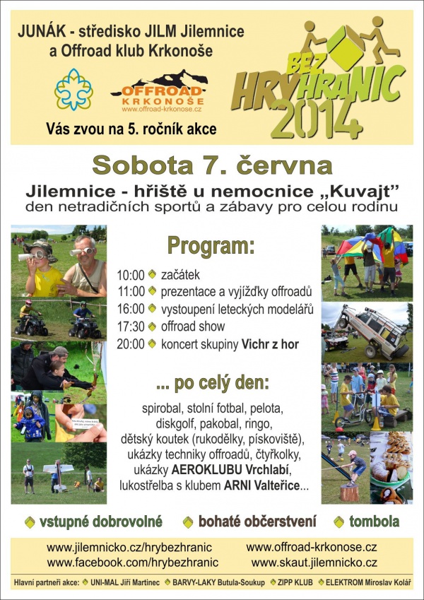 Skautské středisko Jilm Jilemnice ve spolupráci s offroad klubem Krkonoše uspořádaly v sobotu 7. června už 5. ročník akce Her bez hranic. Program začal už dopoledne na hřišti pod nemocnicí v Jilemnici.