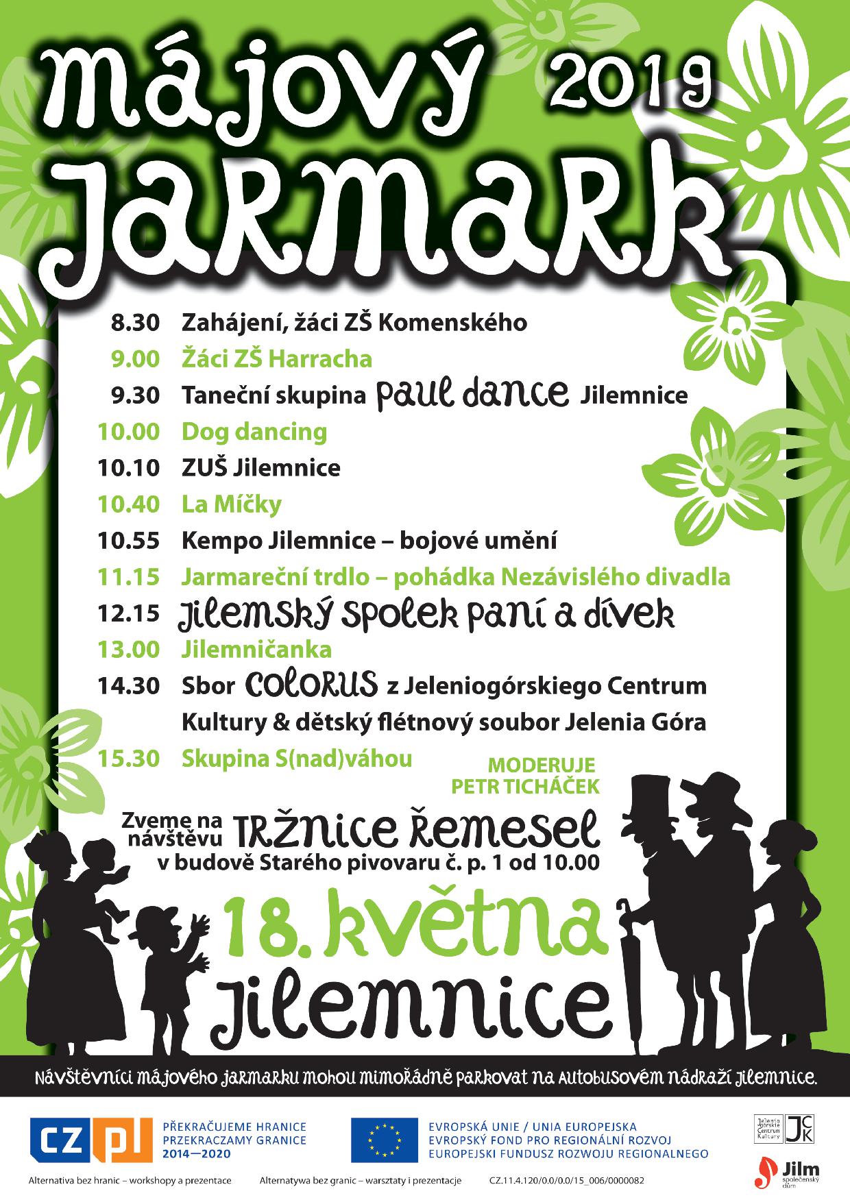 Jilemnický májový jarmark - časový harmonogram (18. 5. 2019): 8.30: zahájení, žáci ZŠ Komenského, 9.00: žáci ZŠ Harracha, 9.30 taneční skupina Paul Dance Jilemnice, 10.00 dogdancing, 10.10 ZUŠ Jilemnice, 10.40: La míčky, 10.55: Kempo Jilemnice - bojové umění, 11.15: Jarmareční trdlo - pohádka Nezávislého divadla, 12.15: Jilemský spolek paní a dívek, 13.00: Jilemničanka, 14.30: Sbor Colorus z Jelení Hory, 15.30: skupina S(nad)váhou.