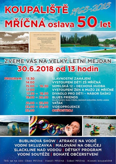 Obec Mříčná srdečně zve na velký letní mejdan a oslavy 50 let otevření koupaliště Mříčná, které se konají v sobotu 30. června. Po celé odpoledne bude připraven bohatý program pro děti - bublinová dílna, velká vodní skluzavka, lodičky a atrakce na vodě, slackline nad vodou, soutěže pro dospělé, ale třeba i výstava k historii koupaliště. Samostatná pozvánka