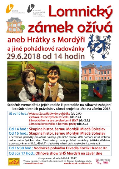 Děti, letní prázdniny začínají. Přijďte je uvítat na lomnický zámek. Připraveno je pro vás vystoupení SHŠ Mordýři, které čítá 2 šermířské pohádky proložené souboji, při nichž můžete pomoci, ať už dobrou radou, nebo fyzickou silou (od cca 14 a 16 hodin), mezi vstupy bude probíhat workshop. Samostatná pozvánka
